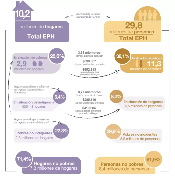 La indigencia, es decir la porción de la sociedad que no logra tener cubiertos los gastos de canasta básica alimentaria, fue 8,2% a fines de 2024. Esto implicó un retroceso respecto al primer semestre de ese año (18,1%) y al fin de 2023 (11,9%).