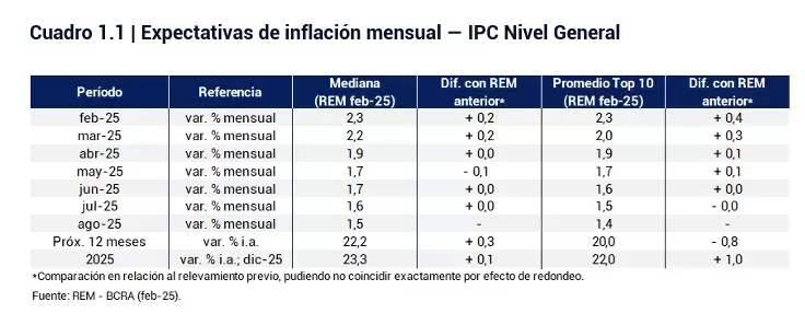 Respecto del IPC Núcleo, el conjunto de participantes del REM ubicó sus previsiones para febrero en 2,3% (+0,2 p.p. respecto del REM previo).